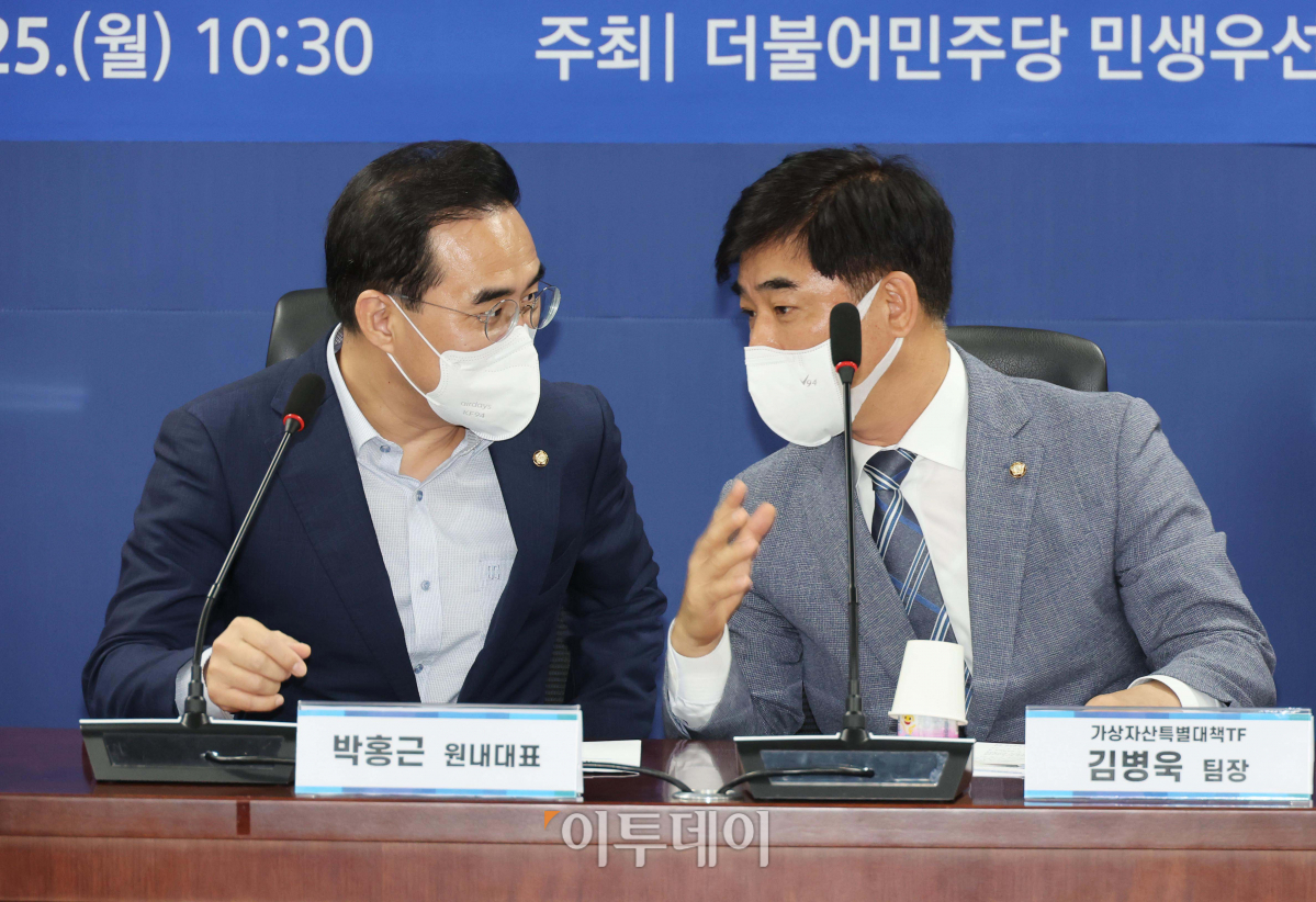 박홍근 더불어민주당 원내대표가 25일 국회 의원회관에서 열린 ‘건전한 가상자산 생태계 조성을 위한 전문가 간담회’에서 김병욱 가상자산특별대책TF 팀장과 이야기를 하고 있다.
