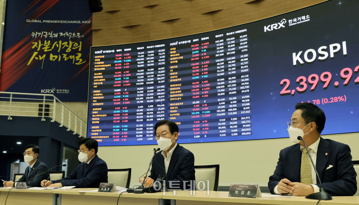 더불어민주당 차기 당 대표 선거에 출마한 이재명 의원이 25일 서울 여의도 한국거래소를 방문, 윤석열 대통령 경제정책 관련 발언을 하고 있다.