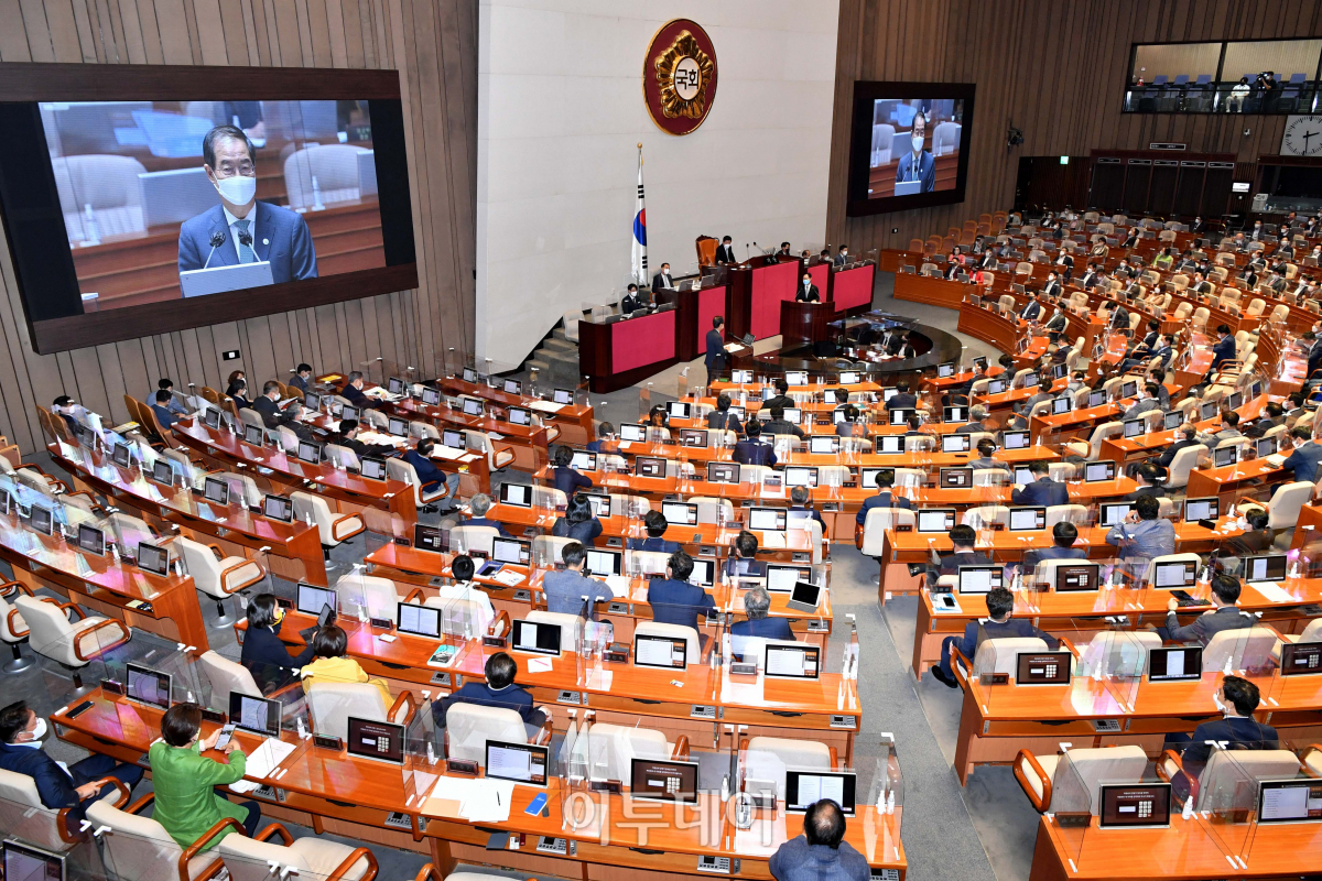 한덕수 국무총리가 25일 서울 여의도 국회에서 열린 본회의 정치·외교·통일·안보 분야 대정부질문에서 박범계 민주당 의원의 질의에 답하고 있다.