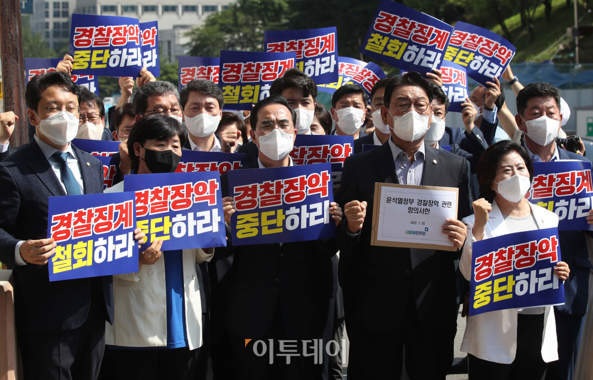 더불어민주당 박홍근 원내대표, 서영교 경찰장악 저지대책단장, 국회 행정안전위원회 야당 간사인 김교흥 의원 등이 26일 오전 서울 용산구 대통령 집무실 인근에서 윤석열 정권 경찰장악 규탄 기자회견을 마친 뒤 대통령실에 항의서한을 전달하기 앞서 구호를 외치고 있다. 국회사진취재단