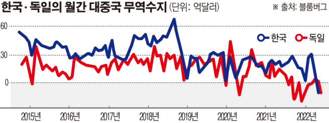 실제 지난 10년간 대중 무역에서 흑자를 기록해온 독일과 한국은 지난달 이례적으로 대중 무역적자를 기록했다. 적자 규모는 한국과 독일이 각각 12억 달러(약 1조5700억 원)에 달했다. 한국의 대중 수출은 이달 1~20일 전년 동기 대비 2.5% 감소해 적자 행진이 계속될 수 있음을 시사했다.