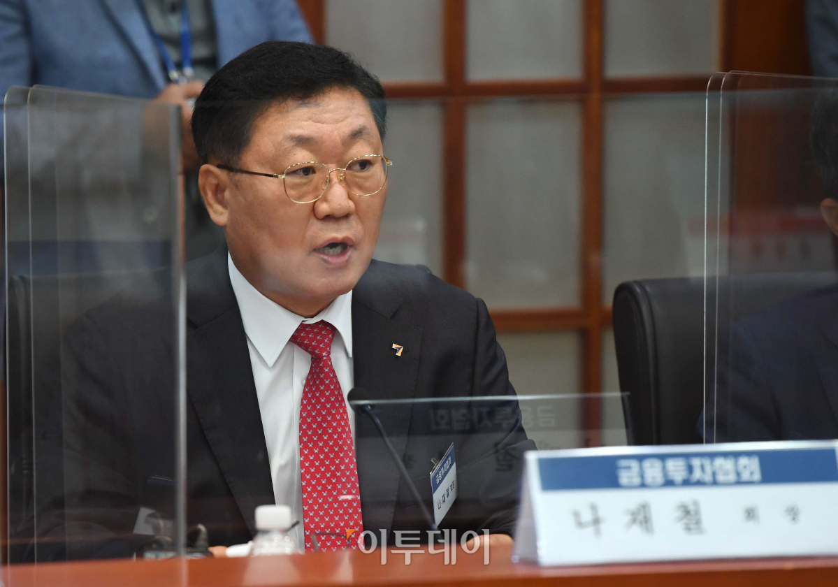 나재철 금융투자협회 회장이 27일 오전 서울 영등포구 여의도동 금융투자센터에서 열린 국민의힘 정책위원회-금융투자업계 현장 간담회에서 환영사를 하고 있다.