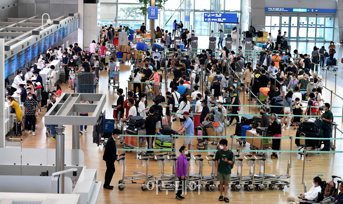 본격적인 여름 휴가철에 접어든 가운데 28일 인천 중구 인천국제공항 제1여객터미널이 해외여행을 떠나려는 피서객들로 붐비고 있다. 인천국제공항공사는 22일부터 내달 10일까지 약 171만 명, 하루 평균 8만6000여 명이 인천공항을 이용할 것으로 보고 있다. 지난해 여름 성수기 대비 7배 이상으로 늘어난 수치다.