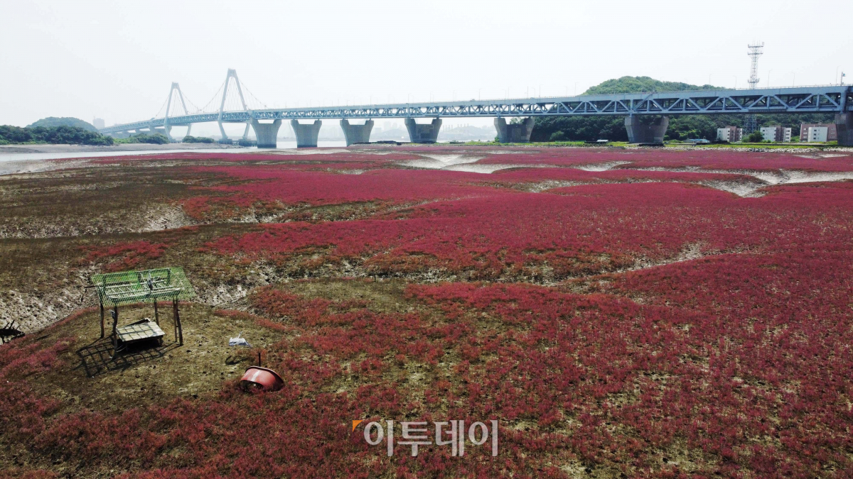 28일 인천 중구 운염도 갯벌에 붉게 물든 칠면초가 군락을 이루고 있다. 칠면조처럼 색이 변한다 해서 이름 붙여진 칠면초는 봄에는 초록빛을 띠다가 여름과 가을이 되면서 몸 전체가 점차 붉은색을 띠어 갯벌을 물들인다.