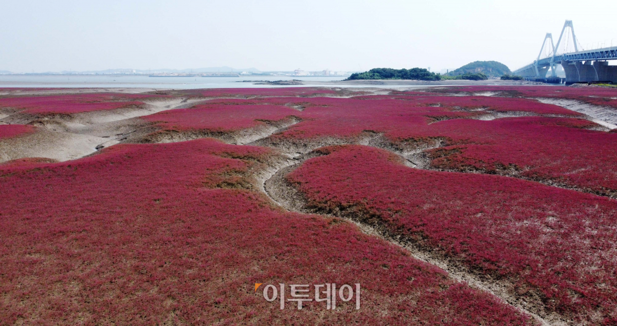 28일 인천 중구 운염도 갯벌에 붉게 물든 칠면초가 군락을 이루고 있다. 칠면조처럼 색이 변한다 해서 이름 붙여진 칠면초는 봄에는 초록빛을 띠다가 여름과 가을이 되면서 몸 전체가 점차 붉은색을 띠어 갯벌을 물들인다.