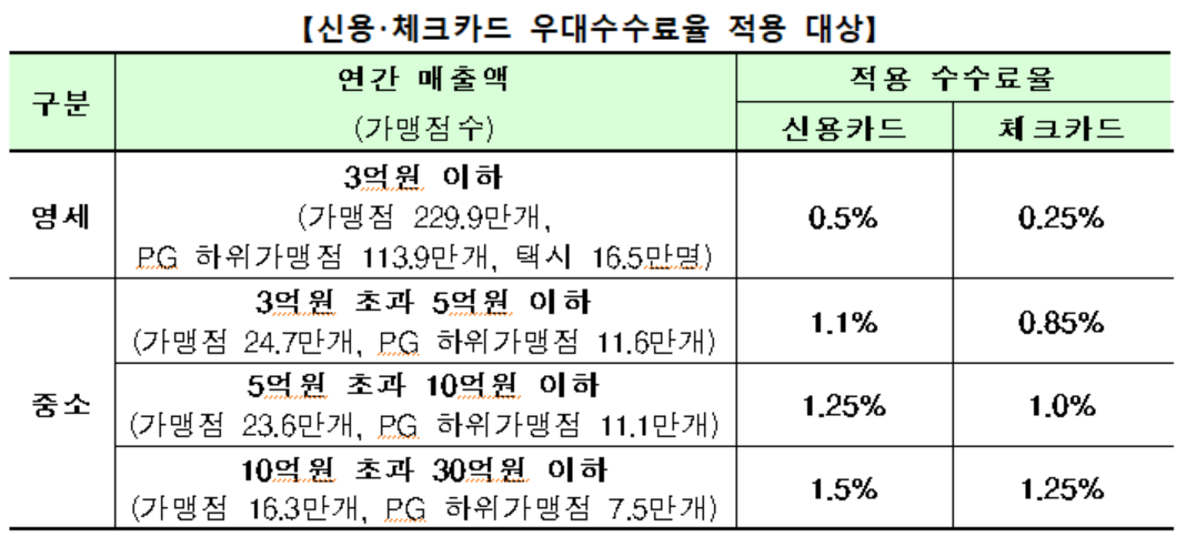 이달 31일부터 30억 원 이하 신용카드 가맹점 294만4000개(전체 가맹점의 96%)와 결제대행업체(PG) 하위가맹점 144만2000개, 개인택시사업자 16만5000명에게 변경된 우대수수료인 0.5~1.5% 가 적용된다.