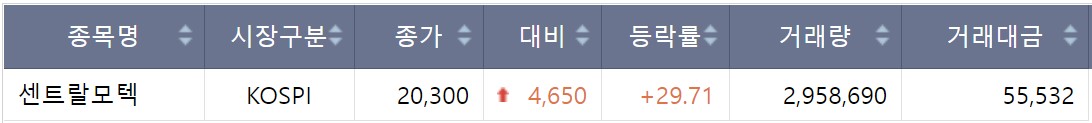 이날 센트랄모텍은 전 거래일보다 29.71%(4650원) 오른 2만300원에 거래를 마쳤다.