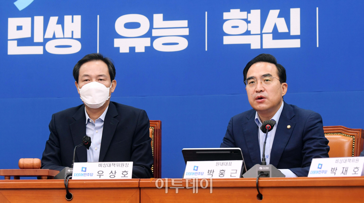 박홍근 더불어민주당 원내대표(오른쪽)가 1일 오전 서울 여의도 국회에서 열린 비상대책위원회의에서 모두발언을 하고 있다.