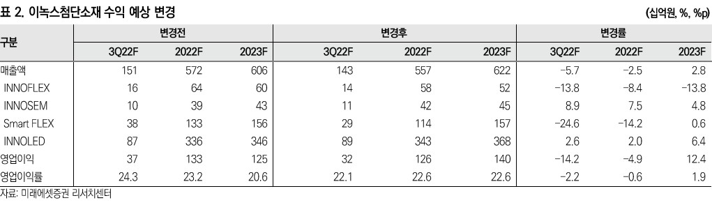 차유미 미래에셋증권 연구원은 “당사 추정 매출 1412억 원과 추정 영업이익 320억 원에 부합하는 2분기 실적을 발표했다”며 “TV, 스마트폰 등 전방 수요 둔화 및 원재료 가격 상승에도 높은 실적 성장세를 지속했다”고 평가했다.