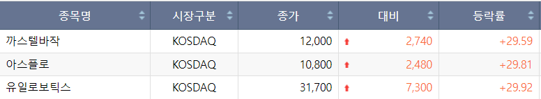 이 가운데 로봇 관련주로 분류되는 유일로보틱스에 매수세가 몰린 것으로 해석된다. 유일로보틱스는 자동화시스템과 산업용 로봇 관련 사업 전문 기업이다.