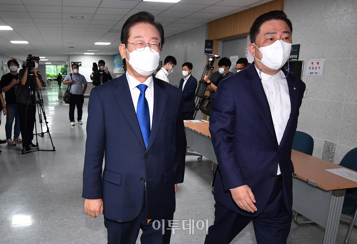 이재명 더불어민주당 의원이 3일 오전 서울 여의도 국회 의원회관에서 열린 기자간담회를 마친 후 이동하고 있다.