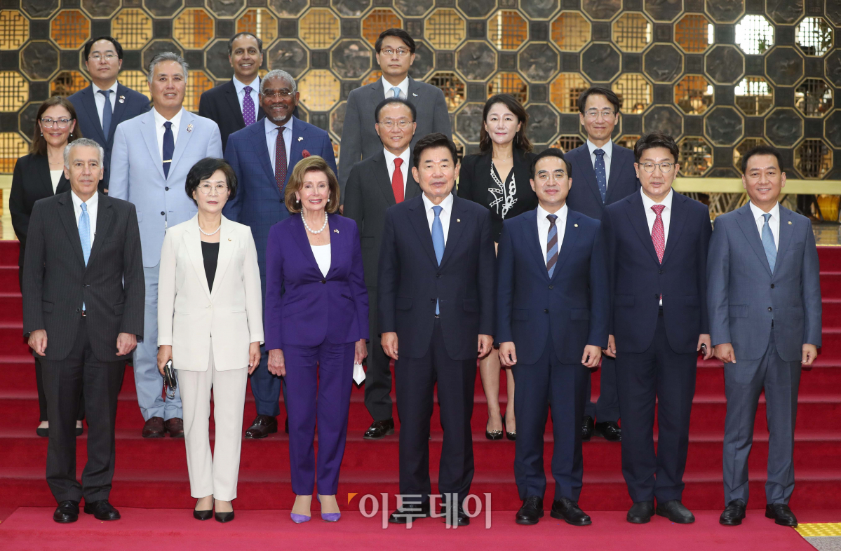 김진표 국회의장과 낸시 펠로시 미국 하원의장이 4일 서울 여의도 국회에서 공동언론 발표를 통해 회담 결과를 발표한 뒤 참석자들과 함께 기념 촬영을 하고 있다.