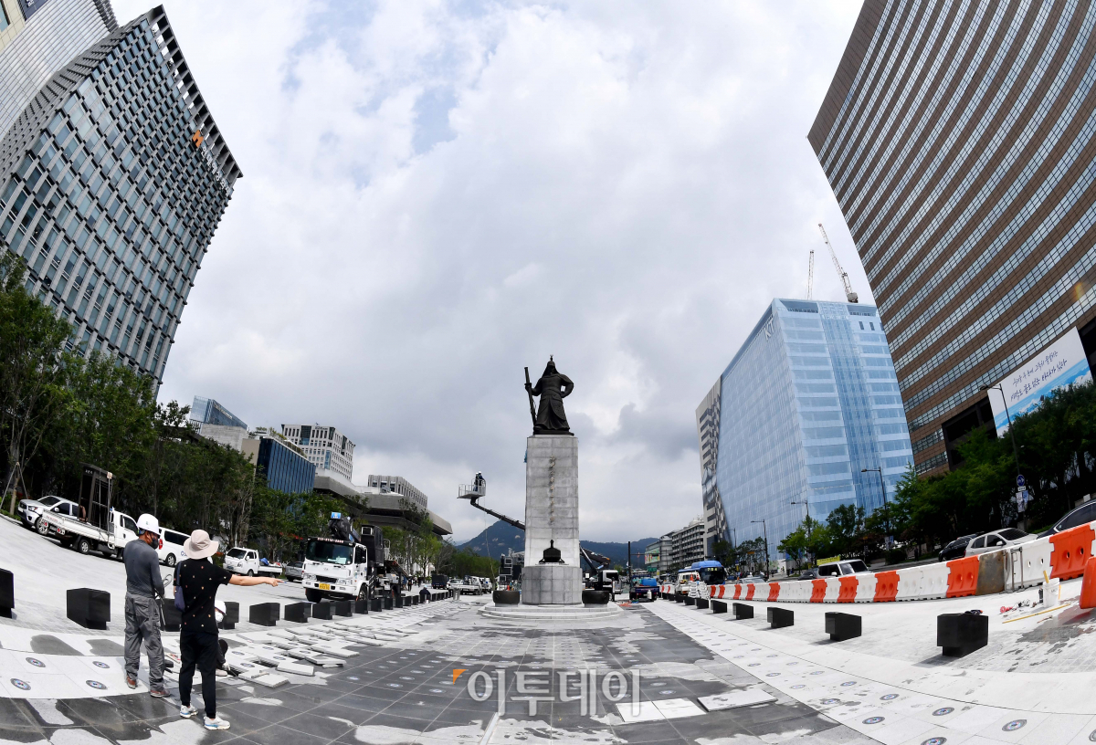 5일 서울 광화문광장 일대가 재개장을 하루 앞두고 마무리 작업에 분주한 모습을 보이고 있다.