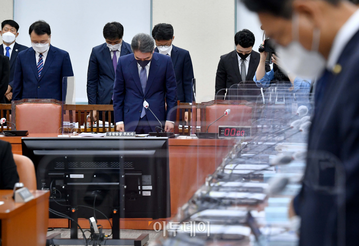 윤희근 경찰청장 후보자가 8일 서울 여의도 국회 행정안전위원회에서 열린 인사청문회에서 이천 병원 화재사고 희생자를 추모하며 묵념하고 있다.
