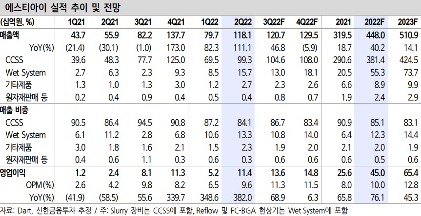 신한금융투자 고영민 연구원은 “올해 실적으로 매출액 4480억 원, 영업이익 450억 원을 전망한다”며 “분기별 실적 흐름은 상저하고의 양상일 것으로 예상한다. 삼성전자 P3 Phase 2~4 향 대규모 프로젝트 매출을 주 기반으로 한다는 점에서 가시성이 높다”고 진단했다.