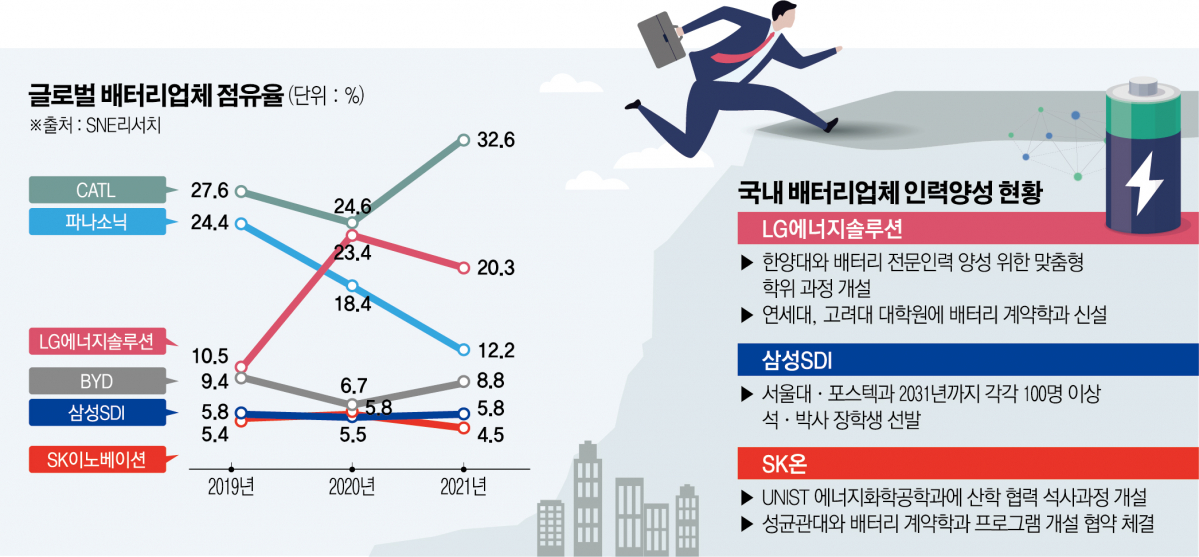 인재난 극복을 위해 국내 배터리 업체들은 대학교와 손잡고 계약학과를 설립하며 직접 인력 양성에 나섰다.
