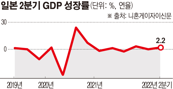 15일 블룸버그통신에 따르면 일본 내각부는 이날 2분기 국내총생산(GDP)이 전분기 대비 0.5%, 연율 환산으로는 2.2% 증가했다고 발표했다.