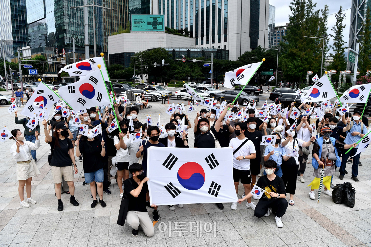 제77주년 광복절인 15일 '태극기 물결 대행진'에 참가한 시민들이 태극기를 흔들며 서울 종로구청에서 보신각 방향으로 행진하고 있다.