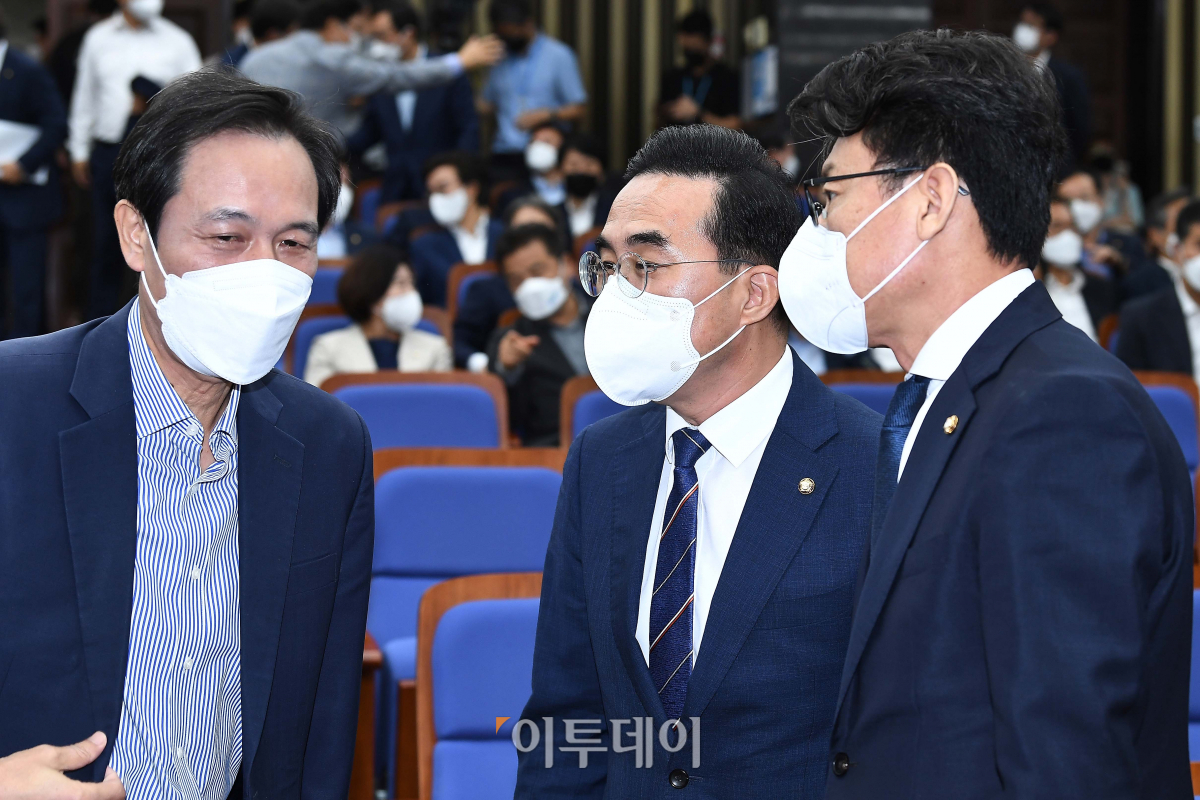 더불어민주당 우상호 비상대책위원장(왼쪽부터)과 박홍근 원내대표, 진성준 의원이 16일 서울 여의도 국회에서 열린 의원총회에서 대화를 나누고 있다.