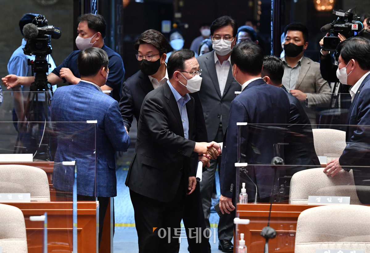 주호영 국민의힘 비상대책위원장과 권성동 원내대표가 16일 서울 여의도 국회에서 열린 국민의힘 의원총회에 참석하며 의원들과 인사하고 있다.