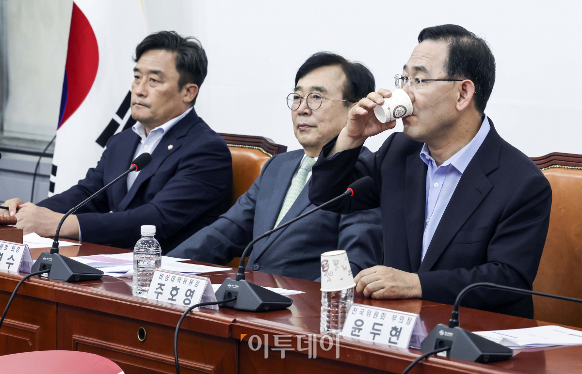 주호영 국민의힘 비상대책위원장이 16일 오후 서울 여의도 국회에서 열린 제5차 상임전국위원회에서 물을 마시고 있다.