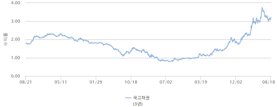 이날 서울 채권시장에서 3년 만기 국고채 금리는 전 거래일보다 0.072%P 오른 연 3.197%에 장을 마쳤다.