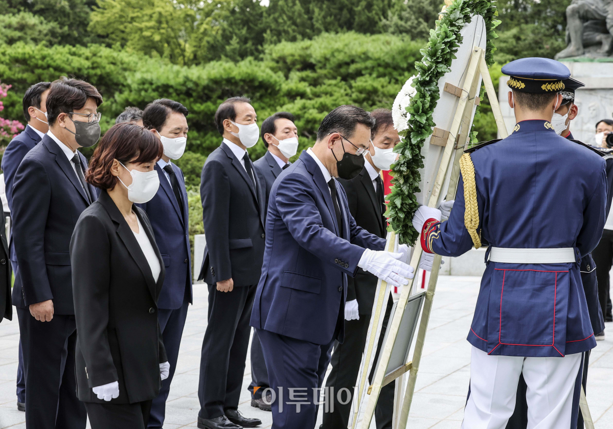 주호영 국민의힘 비상대책위원장과 비대위원들이 22일 오전 서울 동작구 국립서울현충원을 찾아 참배, 헌화하고 있다. 국회사진취재단