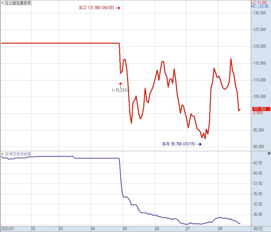 22일 한국거래소에 따르면 오스템임플란트의 종가는 10만1300원으로 6거래일 연속 하락 흐름에서 벗어났다. 이날 회사 주가는 장중 9만9300원까지 떨어지면서 5월과 7월에 이어 또다시 종가 기준 10만 원대 하향에 대한 우려를 키우고 있다.