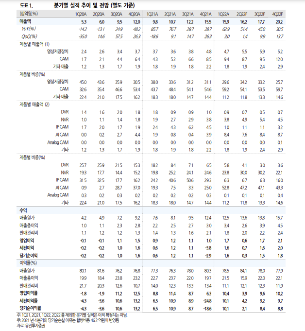 박 연구원은 “하반기는 상반기 대비 매출액이 더 증가하면서 실적 성장세를 지속할 것”이라며 “특히 고부가가치 제품인 NVR. AI CAM 관련 매출 성장이 크게 발생하면서 하반기 수익성이 개선될 것”이라고 내다봤다.