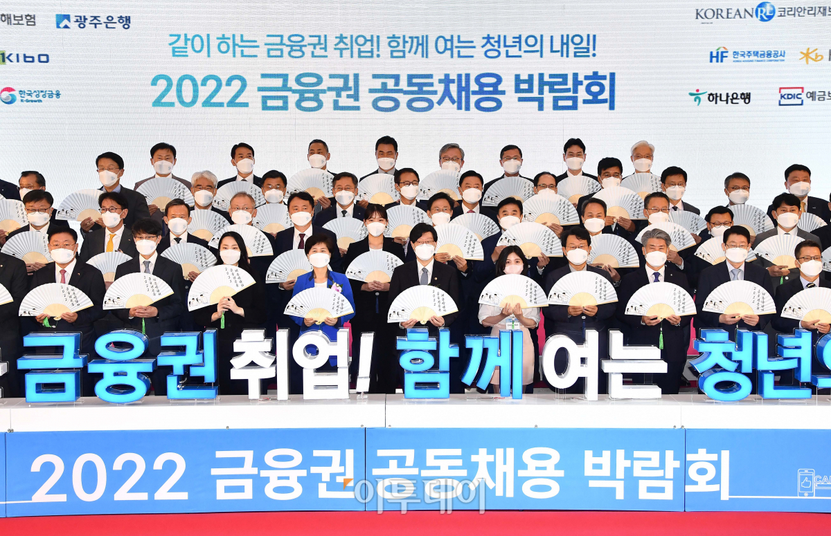 김광수 은행연합회장, 백혜련 국회 정무위원장, 김소영 금융위 부위원장 등이 24일 서울 중구 동대문디자인플라자(DDP)에서 열린 ‘2022 금융권 공동채용 박람회’에서 기념촬영을 하고 있다. 금융권 58개사(은행 11개사, 금융투자 7개사, 여신전문 8개사, 보험 12개사, 금융공기업 14개사, 협회 6개)가 참여, 3년만에 대면으로 열린 이번 금융권 공동채용 박람회에선 6개 은행(KB국민·신한·하나·우리·NH농협·IBK기업)이 우수면접자에게 향후 채용시 서류전형을 면제하는 현장 면접을 진행했으며, 채용설명회, 메타버스 모의면접, 해외취업관 등 청년을 위한 다양한 프로그램도 제공됐다.