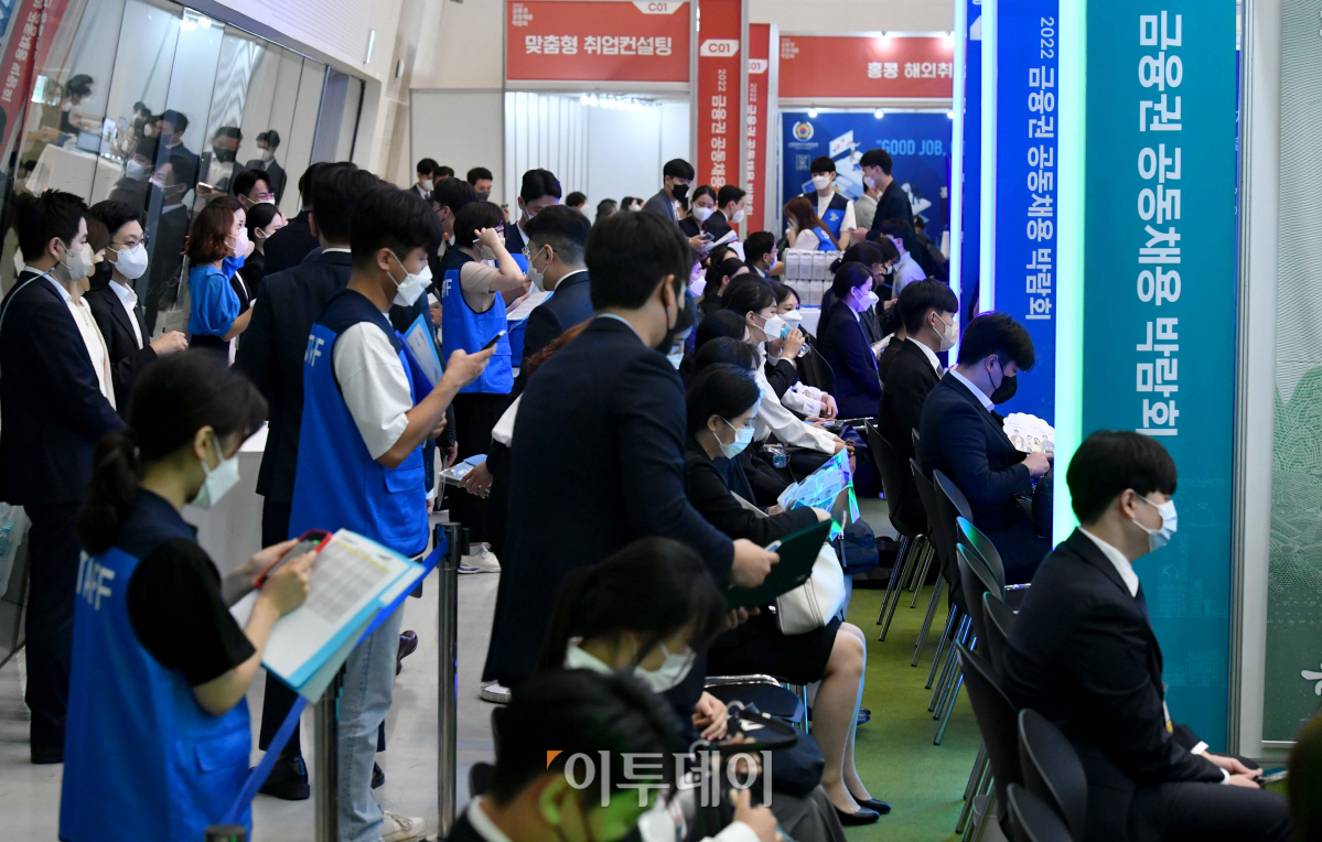 24일 서울 중구 동대문디자인플라자(DDP)에서 열린 ‘2022 금융권 공동채용 박람회’에서 구직자들이 현장 면접을 기다리고 있다. 금융권 58개사(은행 11개사, 금융투자 7개사, 여신전문 8개사, 보험 12개사, 금융공기업 14개사, 협회 6개)가 참여, 3년만에 대면으로 열린 이번 금융권 공동채용 박람회에선 6개 은행(KB국민·신한·하나·우리·NH농협·IBK기업)이 우수면접자에게 향후 채용시 서류전형을 면제하는 현장 면접을 진행했으며, 채용설명회, 메타버스 모의면접, 해외취업관 등 청년을 위한 다양한 프로그램도 제공됐다.