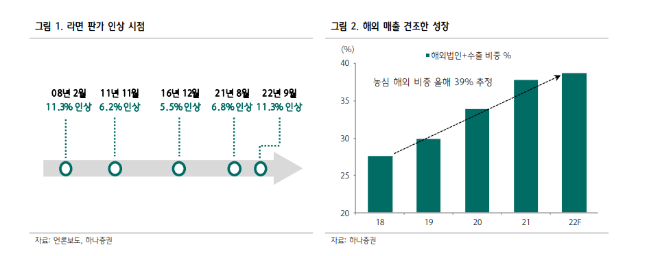 심은주 하나증권 연구원은 “전일 농심이 내달 15일부터 라면 판가 평균 11.3%, 스낵 5.7% 인상을 공지했다”며 “마지막 판가 인상 시점은 작년 8월”이라고 했다.