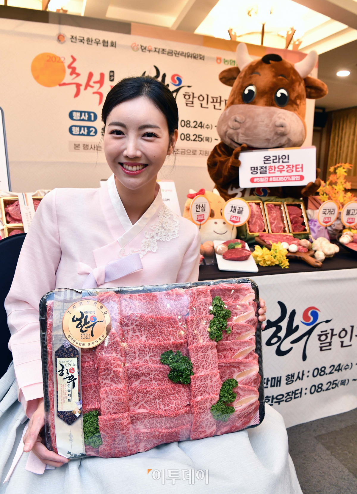 25일 서울 중구 프레스센터에서 한우자조금관리위원회가 ‘2022 추석맞이 한우 할인판매 행사’를 알리고 있다. 온·오프라인 동시에 진행되는 이번 할인판매 행사는 온라인에서 오는 29일까지, 전국 대형마트, 농축협매장 등 오프라인 매장에서는 9월 7일까지 진행된다.
