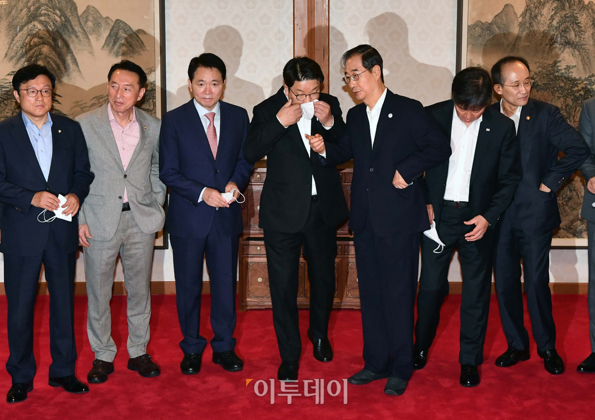 한덕수 국무총리와 권성동 국민의힘 원내대표가 28일 서울 삼청동 총리공관에서 열린 고위 당정 협의회에서 기념촬영을 마친 뒤 대화하고 있다.