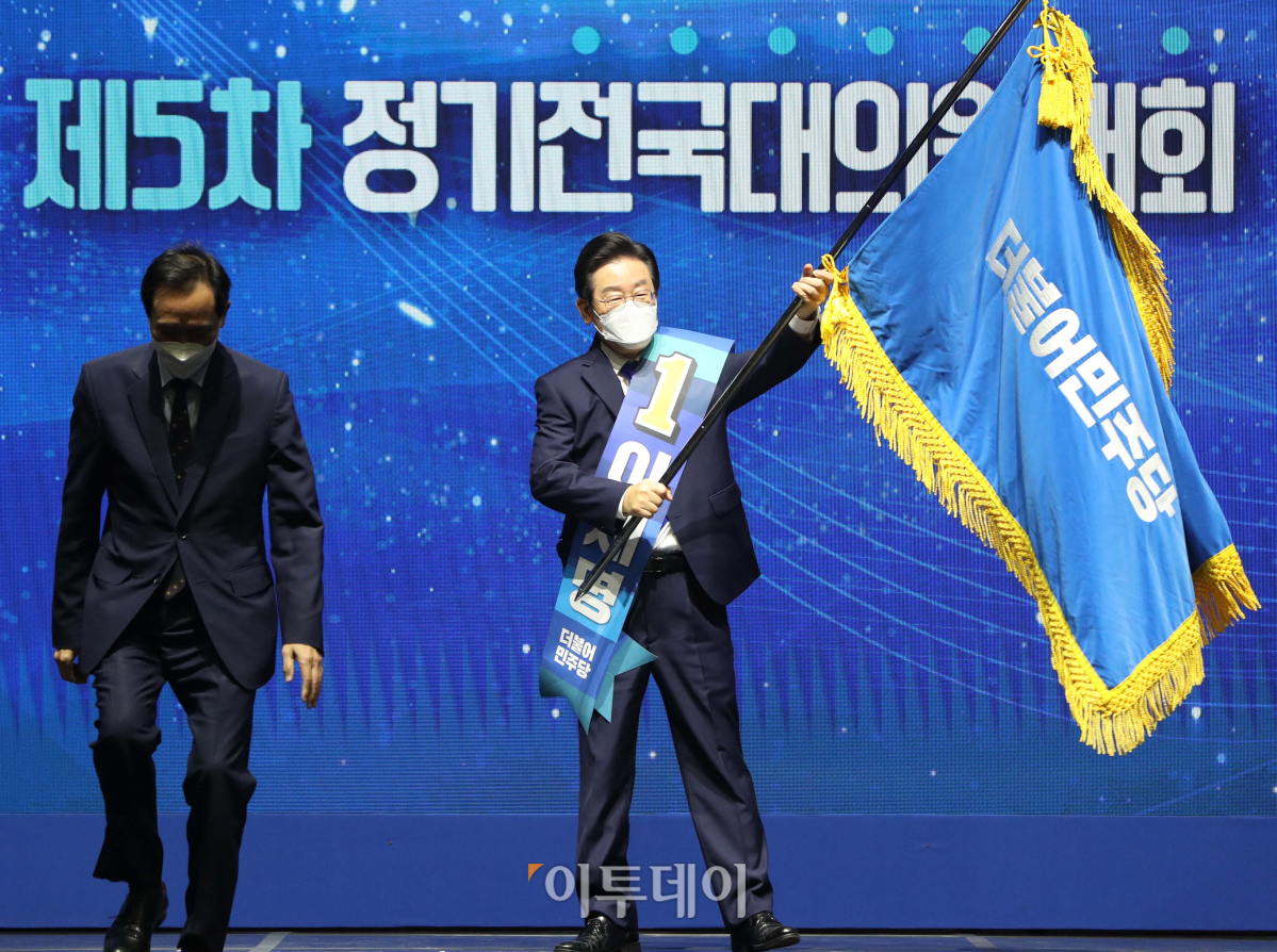 [포토] 당기 흔드는 이재명 민주당 신임 당대표