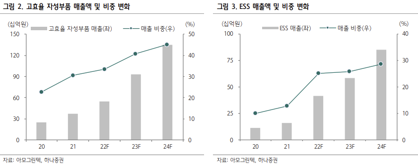 하나증권이 29일 아모그린텍에 대해 올해부터 전기차와 에너지 저장 장치(ESS)향 매출 비중이 상승해 향후 매출 고성장과 수익성의 가파른 개선에 따른 기업가치 제고가 전망된다며 투자의견 ‘매수’와 목표주가 2만 원을 신규 제시했다.
