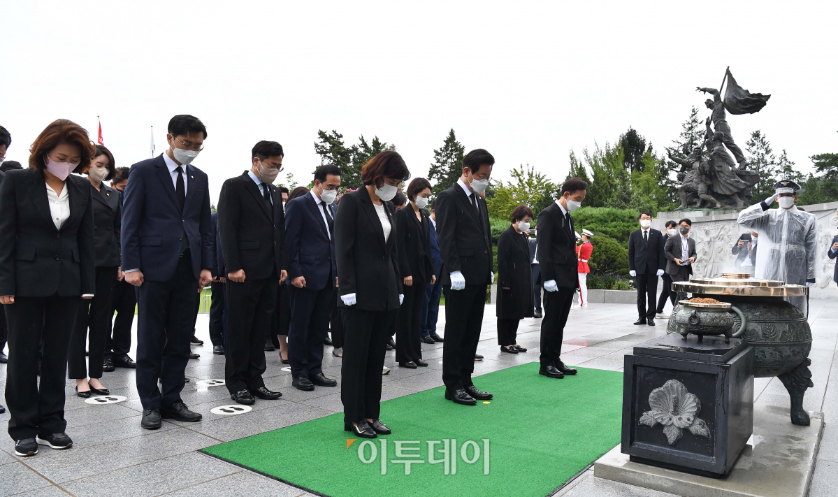 이재명 더불어민주당 신임 당대표를 비롯한 지도부가 29일 오전 서울 동작구 국립서울현충원을 찾아 참배하고 있다. 국회사진취재단