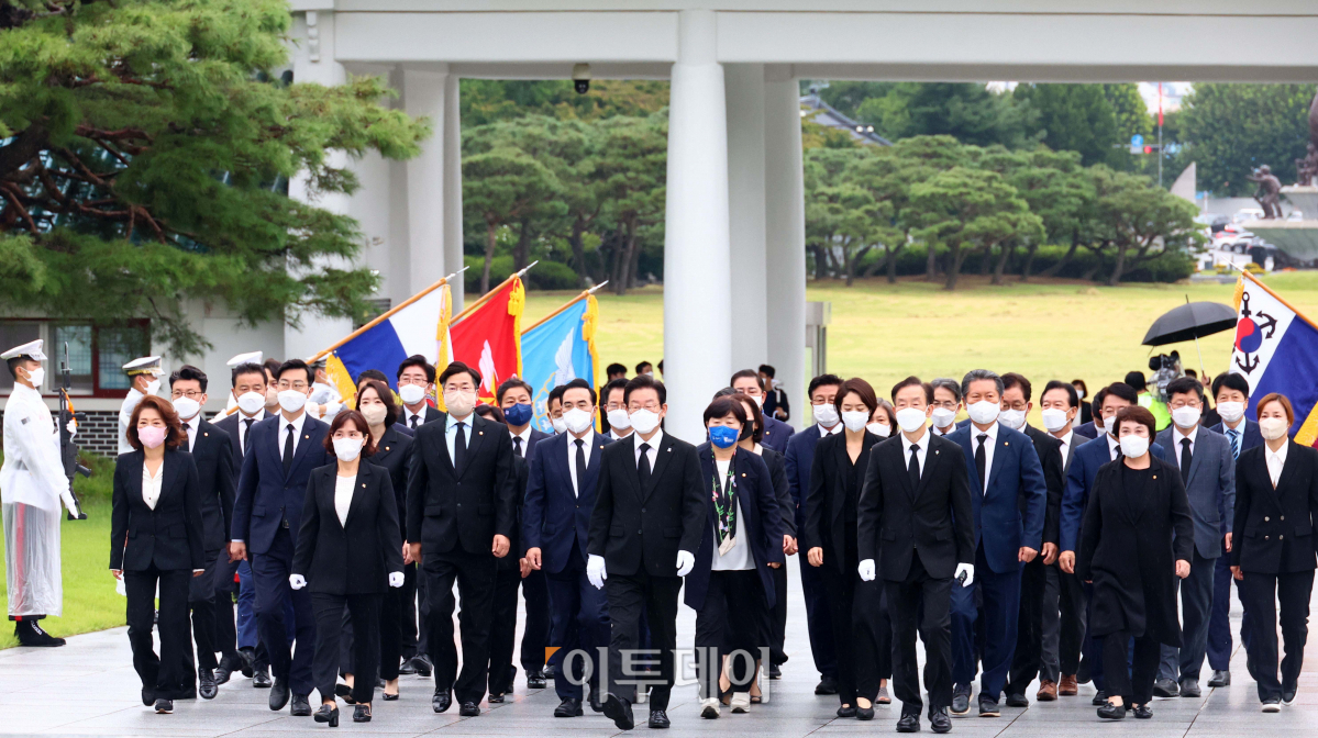 이재명 더불어민주당 신임 당대표와 지도부가 29일 오전 서울 동작구 국립서울현충원을 찾아 참배하고 있다. 국회사진취재단