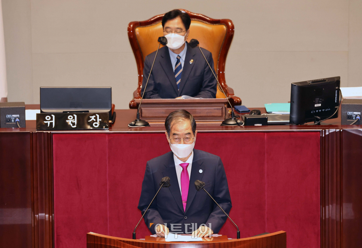한덕수 국무총리가 29일 국회에서 열린 예산결산특별위원회에서 인사말을 하고 있다.