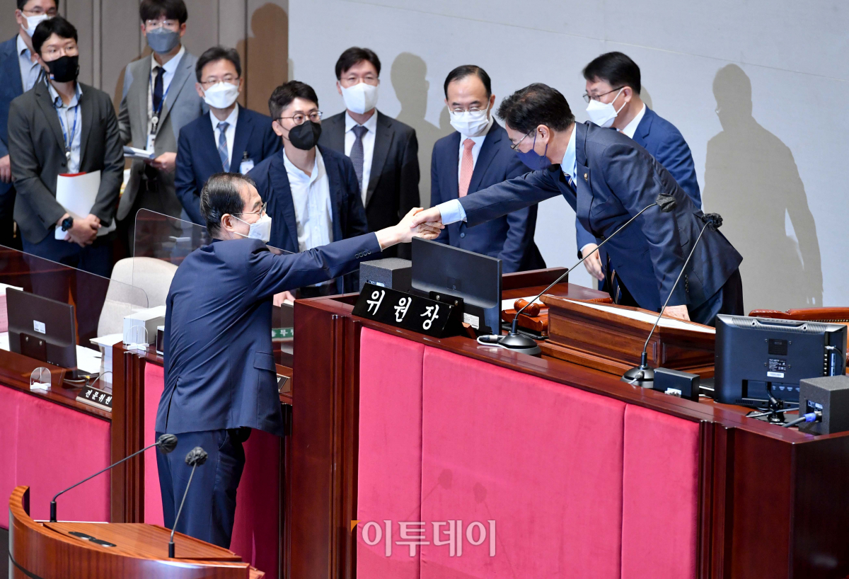 [포토] 인사하는 한덕수 국무총리-우원식 예결위원장