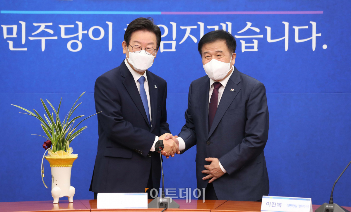 이재명 더불어민주당 대표가 30일 서울 여의도 국회에서 이진복 대통령실 정무수석을 접견하고 있다.