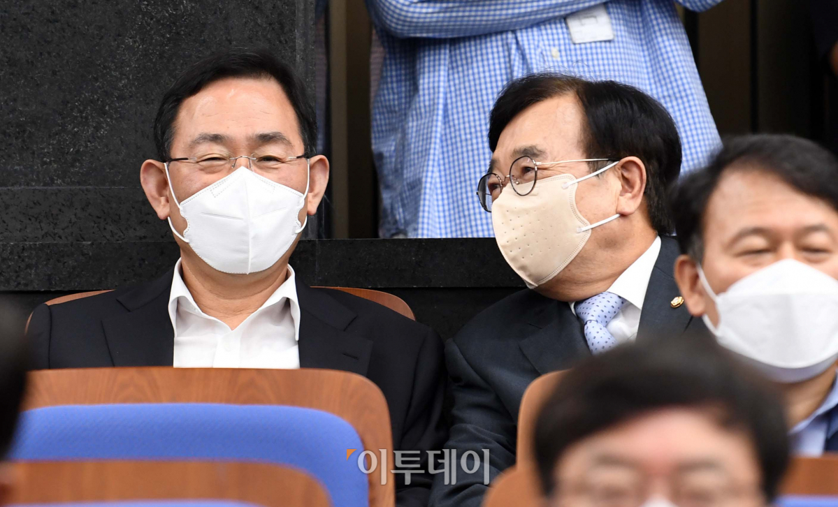 주호영 국민의힘 비상대책위원장(왼쪽)과 서병수 전국위원회 의장이 30일 서울 여의도 국회에서 열린 의원총회에 참석해 대화를 나누고 있다.