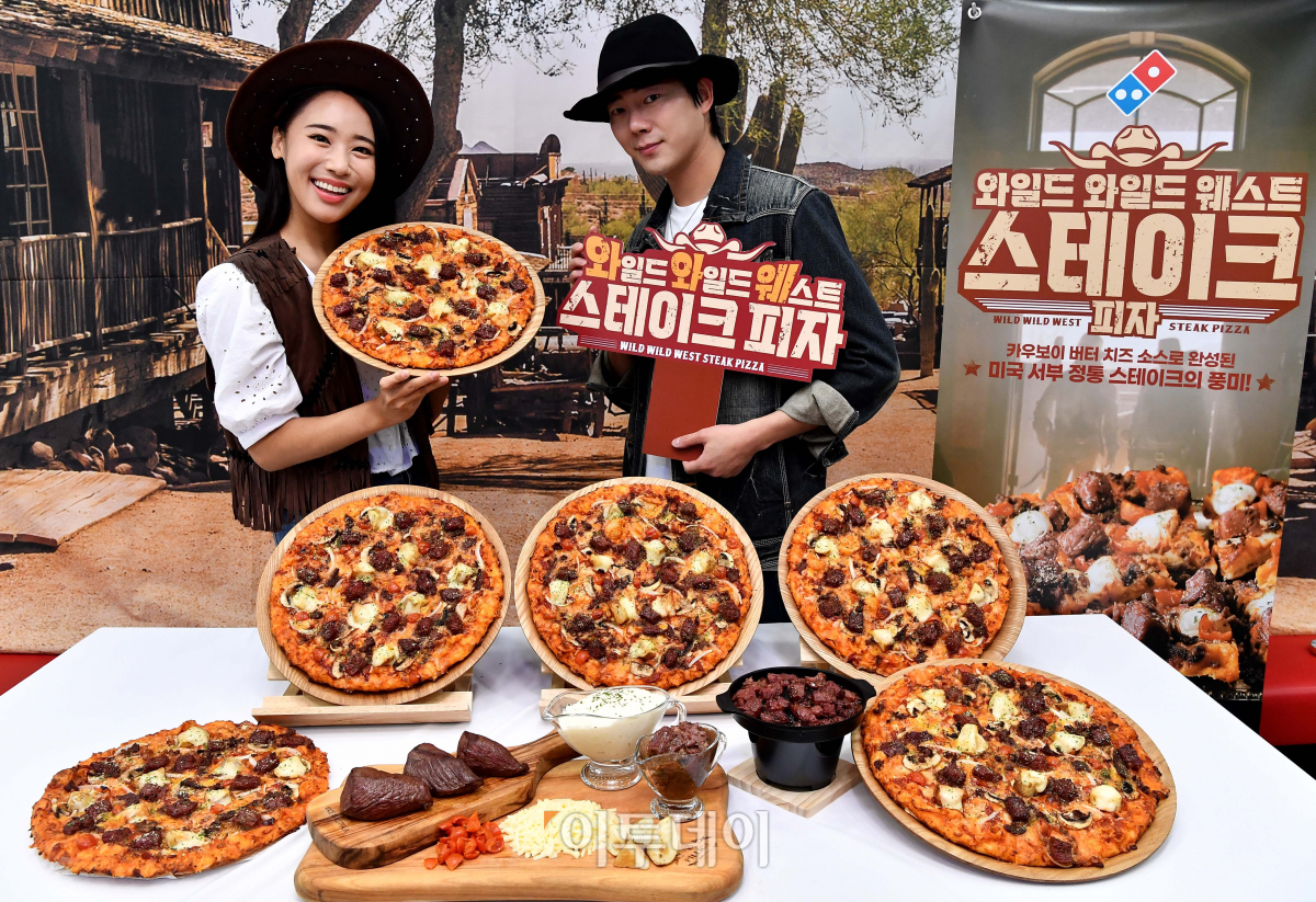 도미노피자가 31일 서울 중구 도미노피자 명동점에서 미국 서부 정통 스테이크의 풍미를 지닌 ‘와일드 와일드 웨스트 스테이크 피자’ 출시행사를 갖고 있다. 와일드 와일드 웨스트 스테이크 피자는 과거 미국 서부에서 카우보이들이 즐겨 먹던 방식(시즈닝 된 소고기를 불에서 빠르게 그릴링)으로 구운 스테이크를 사용했으며, 역대 도미노피자 제품 중 가장 많은 비프스테이크 토핑을 올렸다. 9월 2일부터 전국 도미노피자 매장에서 만나 볼 수 있는 와일드 와일드 웨스트 스테이크 피자는 L 사이즈 3만3900원, M 사이즈 2만8000원이다.