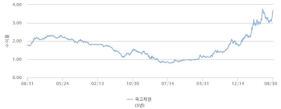 이날 서울 채권시장에서 3년 만기 국고채 금리는 전 거래일보다 0.043%P 오른 연 3.685%로, 10년물은 0.026%P 상승한 3.721%를 각각 기록했다.