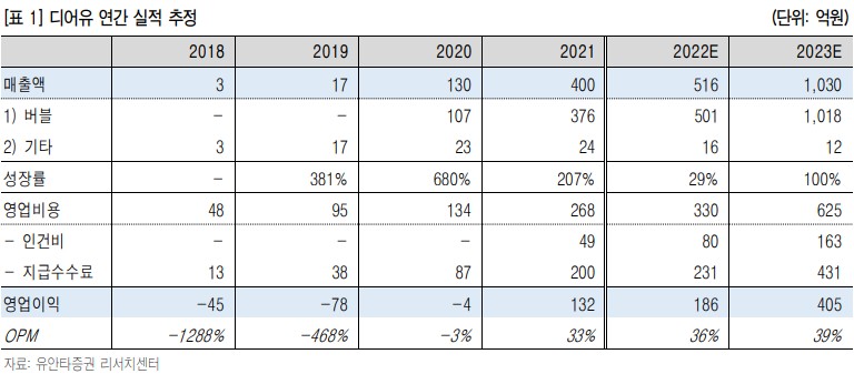 그는 “시장에서 높은 충성도를 가지는 콘텐츠 지식재산권(IP)을 활용하면서, 동시에 높은 수익성을 시현하고 있는 글로벌 플랫폼 사업자는 소수에 불과하다”며 “또한 지금까지 버블 플랫폼에 입점한 콘텐츠 공급자(아티스트)는 한국 국적이 대부분이었으나, 향후 해외 국적 아티스트의 입점이 본격화되면 글로벌 팬 커뮤니케이션 플랫폼으로서 입지도 강화될 것”이라고 전망했다.