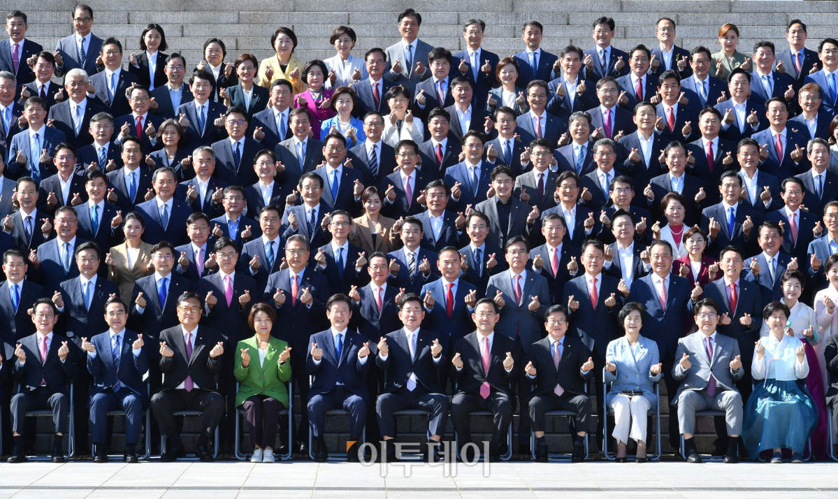 김진표 국회의장, 주호영 국민의힘 비상대책위원장, 이재명 더불어민주당 대표 등 여야 의원들이 1일 서울 여의도 국회 본관 앞에서 21대 후반기 국회의원 단체사진을 촬영하고 있다.