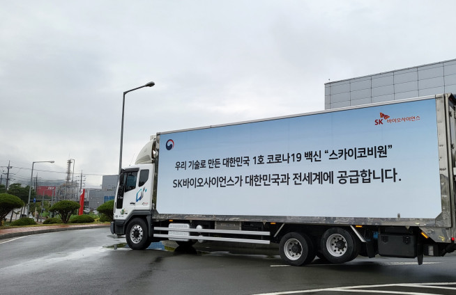 SK바이오사이언스는 2일 합성항원 방식의 자체 개발 코로나19 백신인 ‘스카이코비원’의 초도 물량 출하가 완료돼 경상북도 안동 L하우스에서 기념식을 개최했다고 밝혔다.
