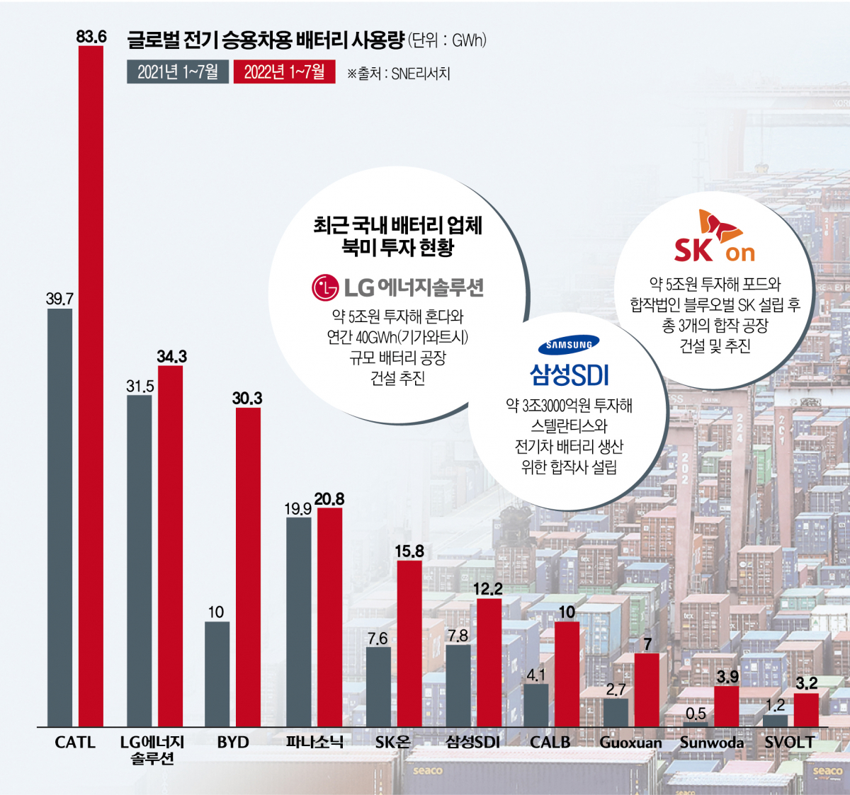 1~7월 글로벌 전기차 배터리 시장에서 중국 업체가 세 자릿수 성장률을 기록하며 고속 성장했다. 국내 배터리 업체는 미국의 ‘중국 배터리 고립’ 전략을 토대로 북미에 투자를 확대하며 돌파구를 마련한다는 계획이다.
