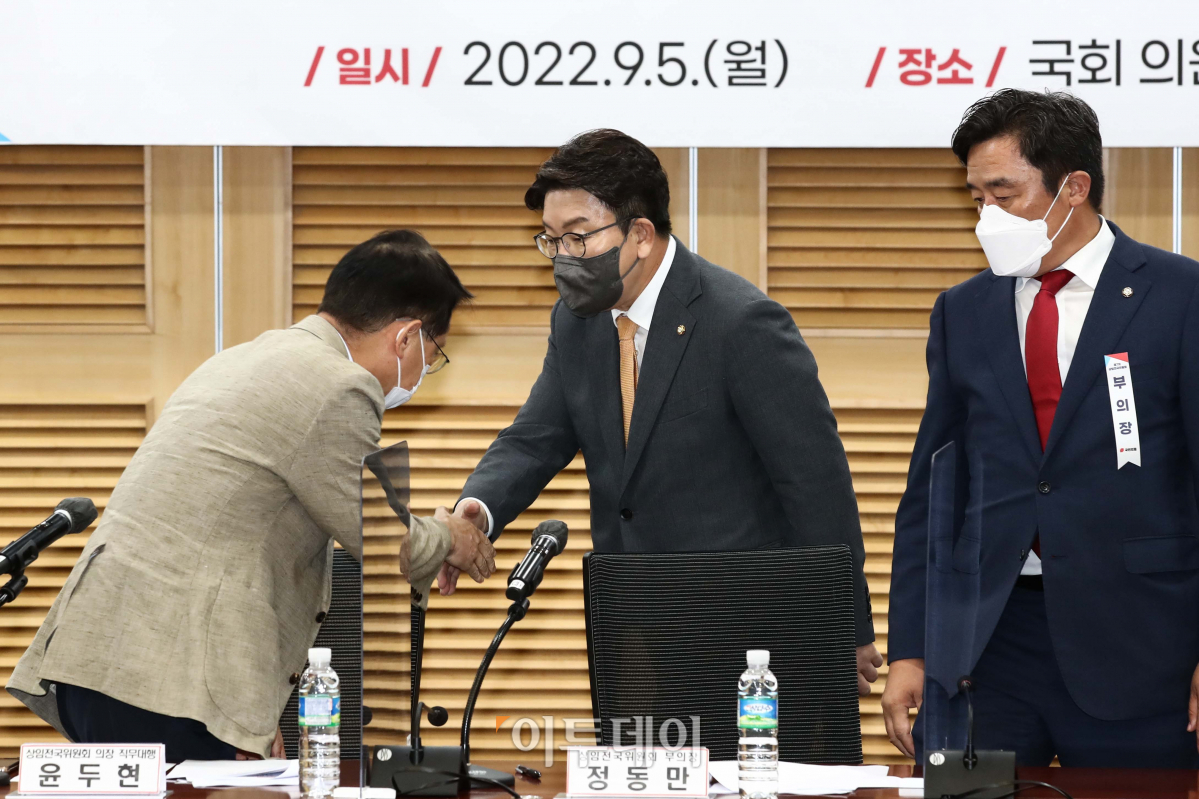 5일 국회 의원회관에서 열린 국민의힘 상임전국위원회에서 권성동 원내대표와 윤두현 국민의힘 상임전국위원회 의장 직무대행이 인사하고 있다.