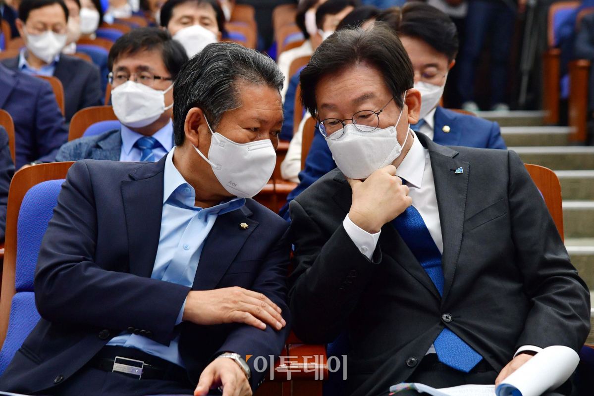더불어민주당 이재명 대표가 5일 서울 여의도 국회에서 열린 비상 의원총회에서 정청래 최고위원과 대화를 하고 있다.